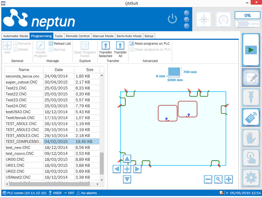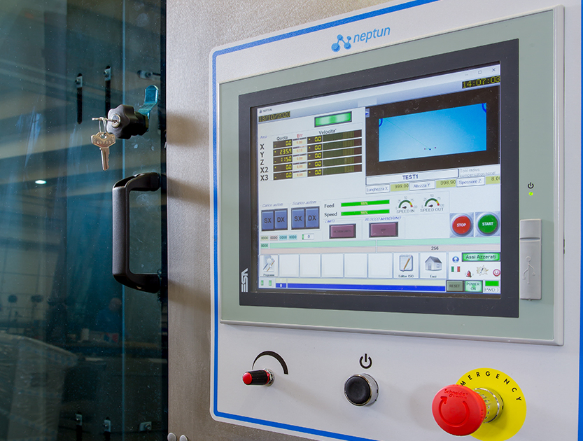 Powerful and intuitive software that facilitates the operator’s work thanks to the ‘drag & drop’ system of thousands of parametric shapes. Also very useful are the ‘nested program’ functions, which allows you to recall a program and repeat it ‘n’ times, having defined the step, and the ‘double zero’, thanks to which the out-of-square shapes can be programmed by choosing between 2 different references with absolute or relative coordinates.