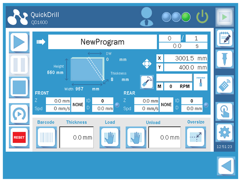 The entry-level Numerical Control drill, built with a solid structure for industrial use and guided by a powerful and intuitive software. The tool change is manual, facilitated by the spindle lock. It is therefore suitable for glass factories that have less pressing production and automation needs, that process small series of glass and tend to have one or a few holes of different diameters on the same glass plate.