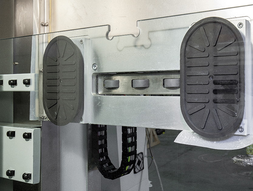 The still glass processing and the positioning of the suction cups always close to the work area allows greater milling speed and grinding precision, especially for threads, compared to models that move the glass.