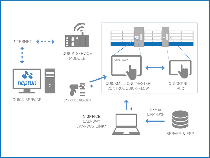 Quickline is the in-line combination, even at different times, of the Quickmill 160-30 and one of the 2 Quickdrills. Ideal for the serial production of doors, shower enclosures, parapets and showcases of medium-large size. Quickline is required in production contexts 24/7, usually in line with washing machines and automatic loading / unloading where downtime, even short, are not tolerated.