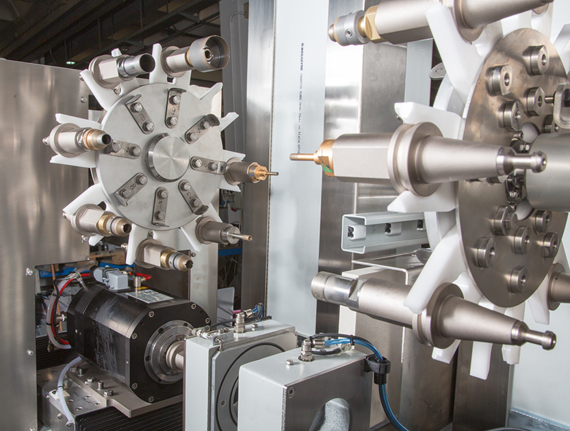 Rotatory tool holder with 8+8 positions, mounted on the spindle head for a tool change in less than 8 seconds.